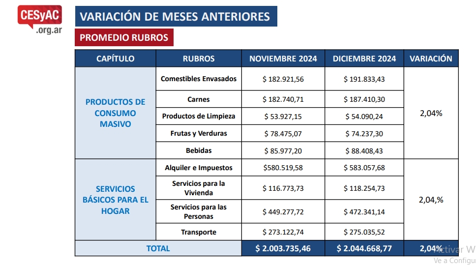 Para el mes de enero de 2025 la canasta de alimentos y servicios se ha ubicado en un total de $ 2.119.246,07